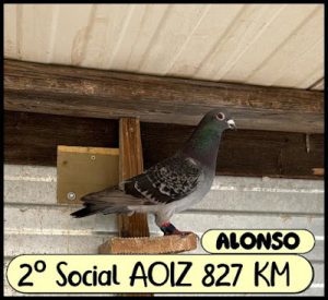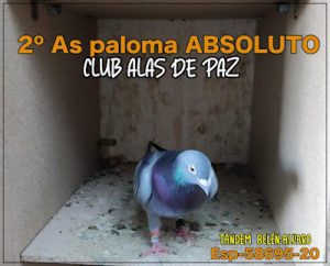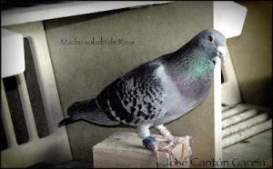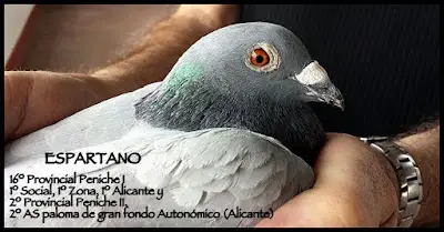 ESPARTANO 100% de mi línea, de hijos nacidos en mi palomar. El padre es un hijo de la Silenciosa (rodada de Carlos). Paloma de once meses que consiguió en el palomar del tándem Brocal (Alicante) un 16 provincial de Peniche I (780 km),  1 social, 1  zona, 1 Alicante y 2 provincial de Peniche II (780 km) obteniendo un increíble 2 AS paloma de gran fondo autonómico, con dos grandes fondos el mismo año bajo sus alas.