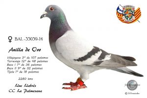 Seguimos con este particular reinas y reyes. Nos desplazamos al palomar de Lluc Llabrés (Mallorca). No para hablaros de grandes fondos pero si de la versatilidad de estas palomas. En el verano del 2014 Luc se llevo unos pichones de casa. Los selecciono el año pasado y lo que le quedó le han dado una burrada de puntos en la presente temporada. De todas ellas me voy a centrar en una, la 33.031-14. El padre es el 75, cruce tía-sobrina, el 92 con la 37, ambos volado de gran fondo. En concreto la 37 de una suelta de un Baza(Granada) dónde sólo llegaron 4 en el día y ella lo hizo en 13 horas de vuelo.Y la madre curiosamente la 75, madre de muy buenas palomas, entre ellas mi 6 Ibizas, AS paloma Social e Insular del 2012, y padre a su vez de la AS paloma Social e Insular del 2015.Palomas capaces de volar un 880 km con 7 meses, y capaces de ganar ases de velocidad con la misma edad. Y no, no he cambiado de opinión. No existen palomas para todo, tipo navaja suiza.La 33031-14 el año pasado logro un 1 social desde Torrevieja (Alicante) 360 km en el club de la Palmesana. Lo sorprendente es que esta misma temporada aparte de otras sueltas incluido Baza, ha logrado otro 1 social desde la misma localidad 360 km (Torrevieja). Dos primeros sociales, dos años diferentes aunque sea un medio fondo, es digno de reseñar.Cuando tenga fotografías las cuelgo, mientras tanto os dejo algunas instantáneas de las magníficas instalaciones de Lluc Llabrés.