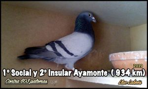 Este año 2019, en la isla de Mallorca, Lluc Llabrés obtiene todo un 1 Social, y 2 Insular desde AYAMONTE (935KM) contra 603 palomas. La madre, la 09 es una hija de la Rodada de Carlos con el 57.