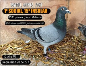 El padre es un hijo fruto del cruce Maya-Lara. Curiosamente Carlos Verger marcó el año pasado de un durísimo Motril, 640 km ….ojo, suelta del 7% !!! La paloma que envié a Carlos, también es un cruce de Mayo-Lara. Y muy buenas noticias. Rafa, Rafael Gómez Font (Mallorca), mete una paloma del Granado (Huelva), 907 km, suelta del 7%. Un 1º social, y 15º Insular…sólo llegaron 20 palomas de 277 enjauladas. Se convierte asimismo en AS paloma social 2023 (ya fue 2 AS paloma social 2022) y 4 AS paloma del absoluto del Grupo Mallorca 2023. Rafael con esta paloma, gana el campeonato del Grupo Mallorca.