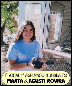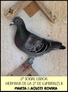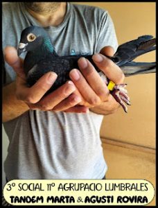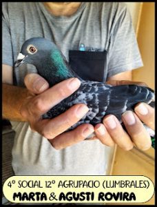 El año pasado una parejita se fue a Cadiz (Andalucía). Criaron 6 pichones que han hecho toda la campaña, y éste de la foto obtiene un 2º social de 827km (AOIZ) Propiedad de Alonso (abonado a los BLOQUES) Hoy nos vamos a Lleida (Cataluña). Agustí Rovira y su hija, abonados a los BLOQUES. Hace un par de años adquirieron varios lotes de mis palomas. Agustí tenía mucha ilusión en este proyecto y apostó de cabeza por mis palomas. Este año sus resultados se han disparado! En la suelta de LUMBRALES II…obtiene un 1, 3 y 4 social de esa suelta, pero un IMPRESIONANTE 1, 11 y 12 de toda la AGRUPACIO CATALANA.